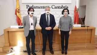 El presidente del Parlamento de Cantabria, Joaquín Gómez (centro); el presidente de AICEC, Antonio Simón, y la vicepresidenta, Laura Diego - PARLAMENTO DE CANTABRIA