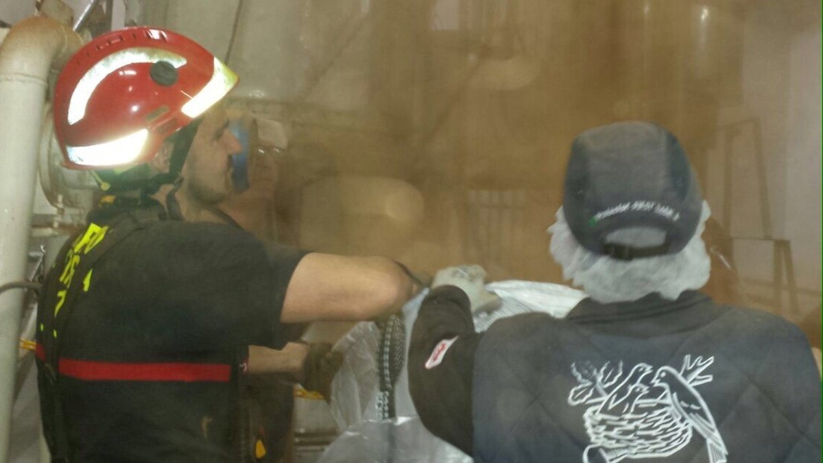 Los bomberos del 112 realizaron mediciones temperatura en la tolva con cámara térmica y ventilaron el interior para bajar la carga calorífica de la masa de cacao.