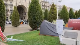 Al menos una decena de tiendas de campaña se han instalado enfrente de la sede del Banco, en unos céntricos jardines de Santander, presididos ahora a su entrada por una tela con el lema 'La bolsa o la vida. La vida'.