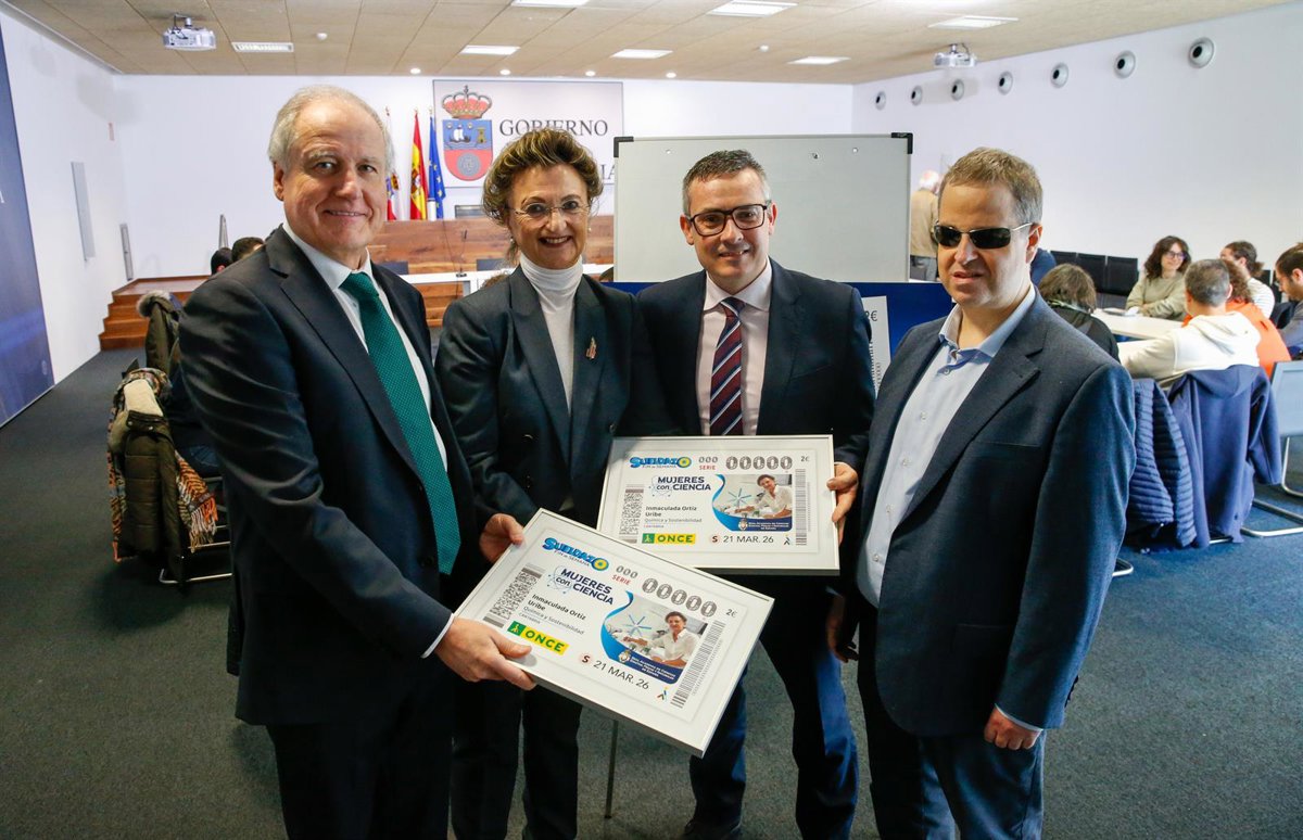 Esta edición del cupón ha sido presentada este lunes por el delegado de la ONCE en Cantabria, Óscar Pérez López, y el consejero de Industria, Eduardo Arasti, acompañados del presidente del Consejo Territorial de la entidad en la región, Sergio Olavarría, y Antonio Cendrero, de la Real Academia de Ciencias.