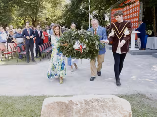 La presidenta de Cantabria, María José Sáenz de Buruaga, y el representante de las Casas de Cantabria, Serafín Fernández Vallejo, colocan la corona de laurel en el Día de las Instituciones - GOBIERNO