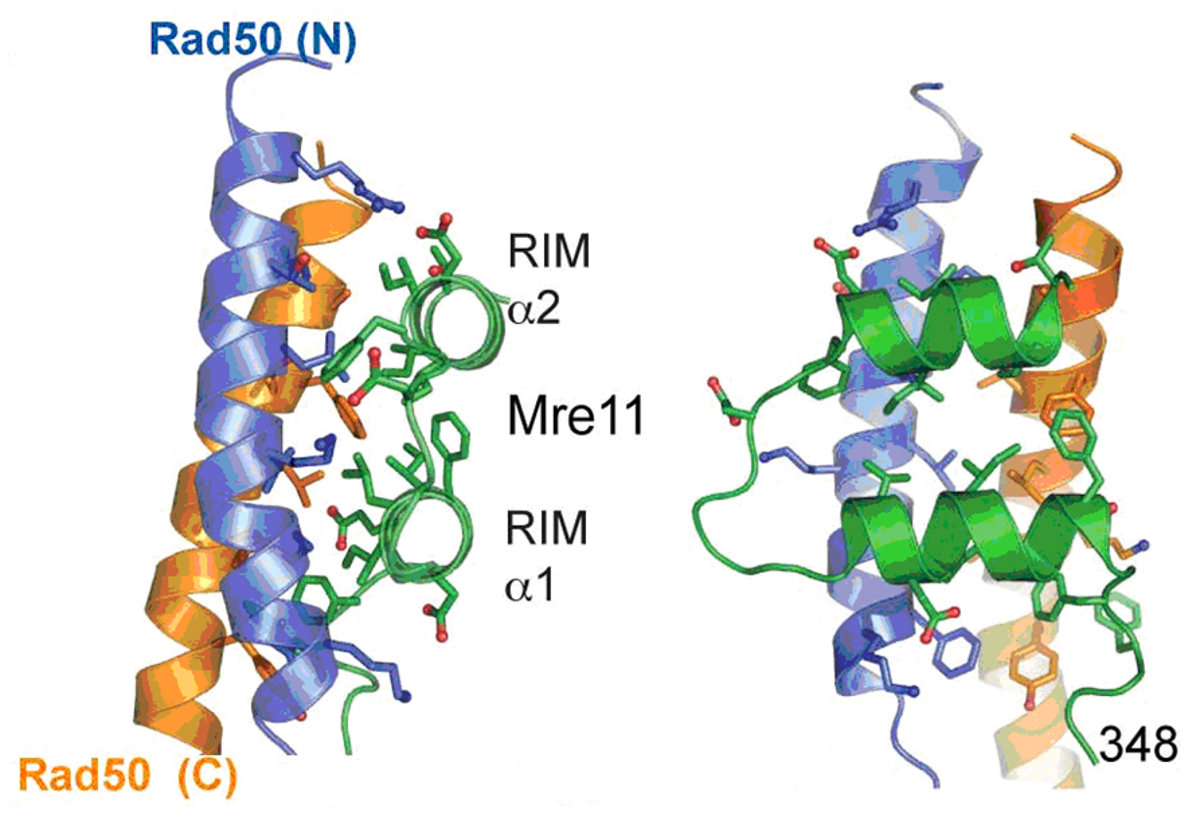 Rad50 y Mre11 son dos de las proteínas que actúan en el proceso de reparación de roturas de ADN de cadena doble por recombinación homóloga, usando cadenas complementarias no dañadas como molde para restaurar la dañada.