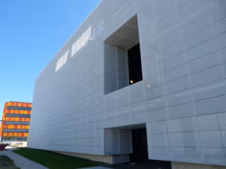 La fachada exterior es un gran cubo recubierto por una chapa perforada de color blanco irisado que permite la entrada de luz pero evita la radiación solar directa en las superficies acristaladas, lo que supone un ahorro energético en aire acondicionado. En el interior un gran patio cúbico reparte la luz a las distintas dependencias.