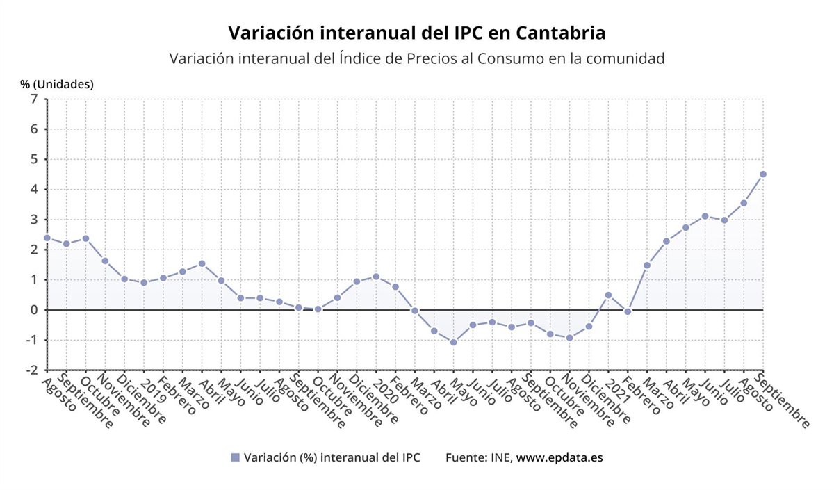 El Índice de Precios de Consumo (IPC) en Cantabria subió un 4,5% en septiembre en comparación con el mismo mes del año anterior, medio punto por encima del conjunto nacional (4%), y un 0,6% respecto al pasado mes de agosto, dos décimas menos que la media (0,8%), según ha informado este jueves el Instituto Nacional de Estadística (INE).