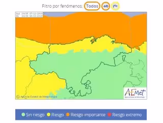 Este aviso amarillo por fenómenos costeros adversos se extenderá hasta el mediodía, cuando subirá de categoría y pasará a nivel naranja (riesgo importante), hasta las 18.00 horas. En esa franja horaria, se prevé que los vientos de componente oeste lleguen a fuerza 8.