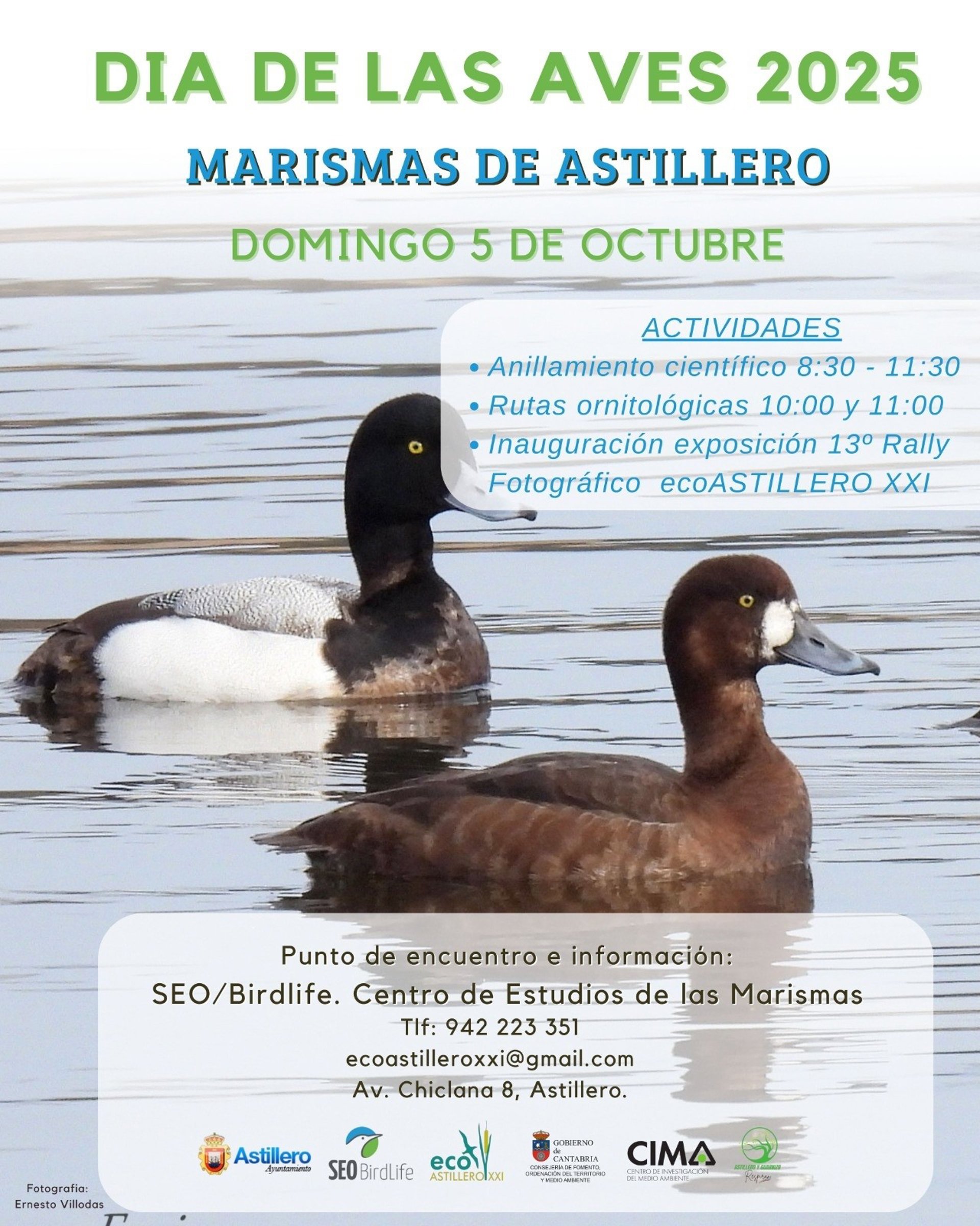 Las Marismas de Astillero serán el epicentro de la celebración del Día de las Aves 2025, el domingo 5 de octubre, con una agenda pensada para acercar la riqueza ornitológica del municipio a toda la ciudadanía y a quienes visiten la localidad.