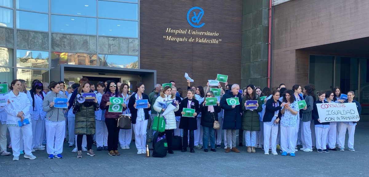 Más de 50 enfermeras se han concentrado este viernes ante las puertas del Hospital Universitario Marqués de Valdecilla, en Santander, para denunciar la "discriminación" y exigir reconocimiento y respeto profesional, con motivo de la conmemoración del Día Internacional de la Mujer (8M).