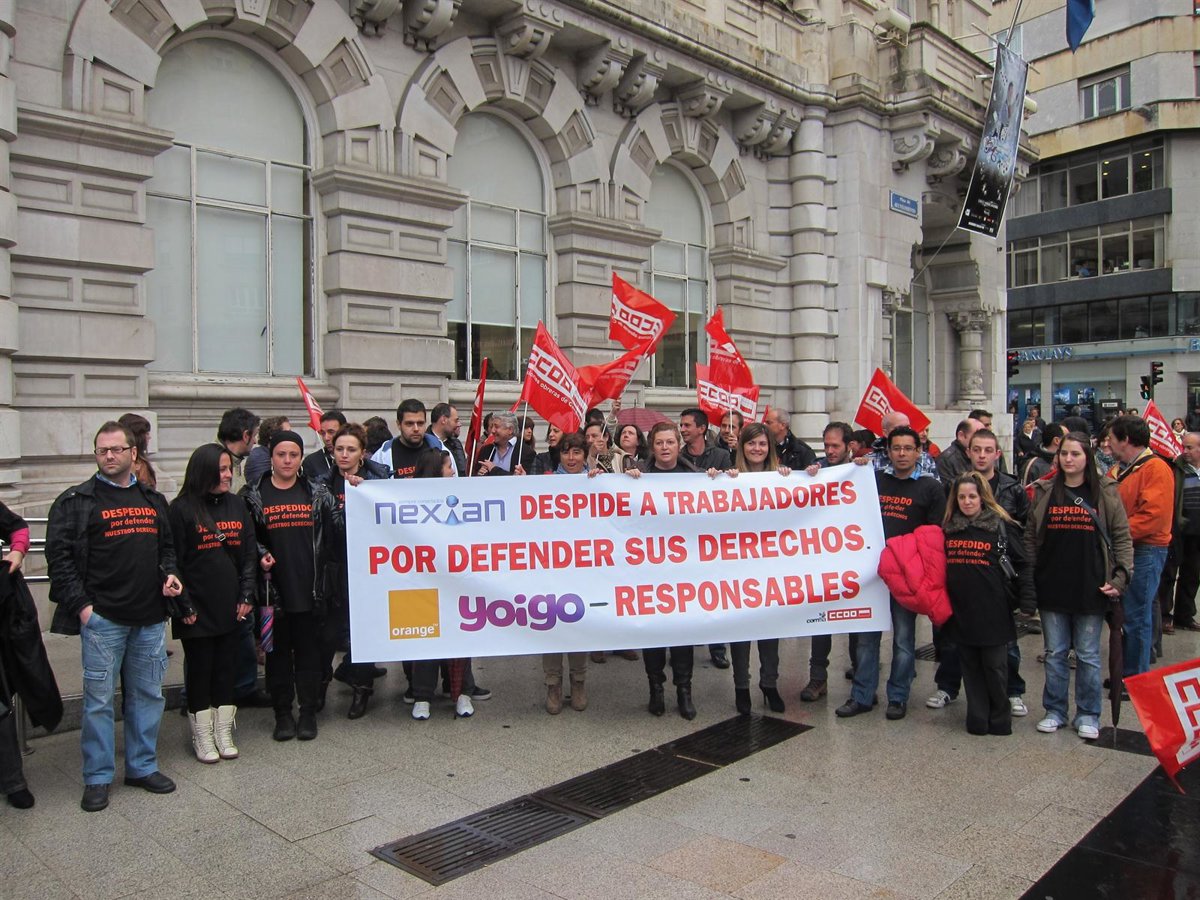 Los manifestantes ha protestado, desde las 12.00 a las 13.00 horas, ataviados con camisetas en las que decía 'Despedidos por defender nuestros derechos', y sujetando una pancarta en la que ponía 'Nexian despide a sus trabajadores por defender sus derechos. Orange y Yoigo, responsables'.