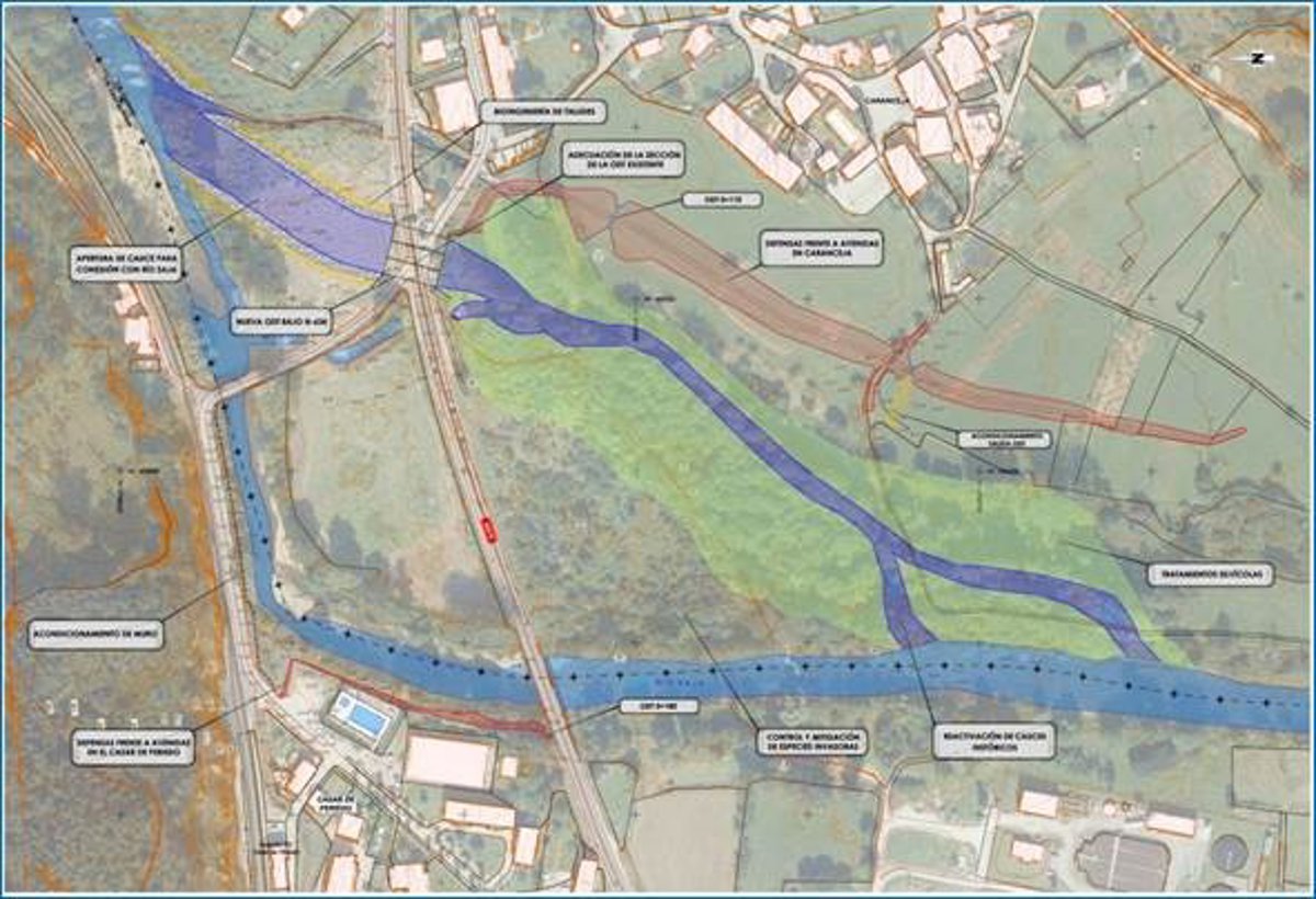 Para ello, el proyecto plantea recuperar antiguos brazos del río Saja, actualmente sin funcionamiento, a los que se les dará continuidad hasta el municipio de Casar de Periedo, para lo que será necesario la construcción de una obra de drenaje bajo la carretera N-634 a su paso por Caranceja.
