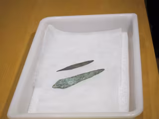 Se trata de dos puñales de espigo, de unos 4.500 años de antigüedad, muy escasos el norte al norte del río Duero --donde están asociados a los vasos cuneiformes--, y de los que el MUPAC no tenía ningún ejemplar hasta ahora. Sí contaba con puñales prehistóricos anteriores, con muescas, y posteriores, de unos 2.000 años, que sustituyeron a los agujeros con remaches.