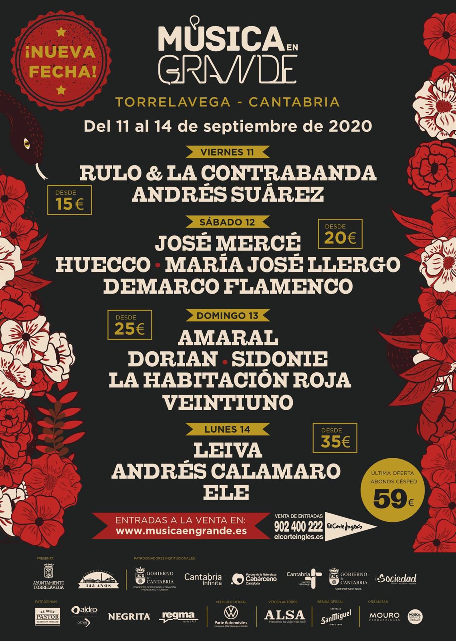 Las únicas bajas que se producen en el cartel que se había anunciado son las de El Barrio, que ha cancelado toda su gira de 2020 por decisión personal, con la intención de visitar Torrelavega en la próxima edición de Música en Grande, y de Natalia Jiménez, con compromisos contraídos previamente en México en esas mismas fechas que impiden su presencia en Cantabria.