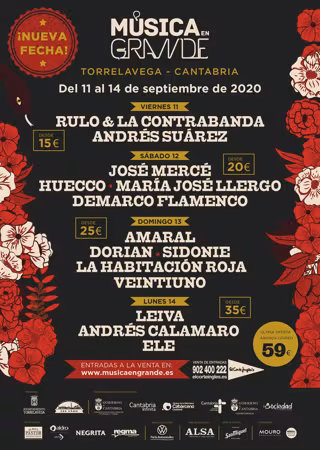 Música en Grande 2020 ha conseguido trasladar al mes de septiembre los conciertos programados y mantiene a más del 80% de los artistas confirmados, por lo que contará con las actuaciones de grupos como Amaral, Andrés Calamaro, Rulo y La Contrabanda, Sidonie, Leiva, Dorian, La Habitación Roja, Andrés Suárez, Ele o Veintiuno, que estarán presentes en esta nueva edición, ha informado la organización.
