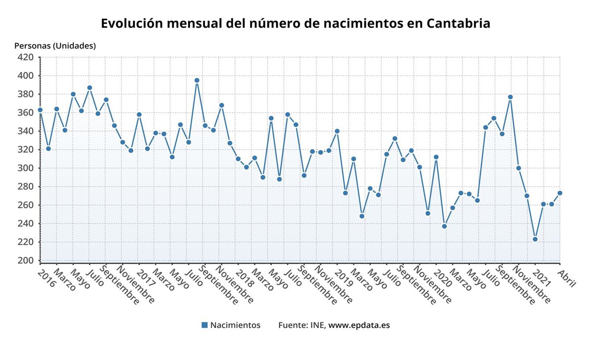 Cantabria registró 273 nacimientos en abril, con lo que ascienden a 1.017 los acumulados, un -13,12% menos que en el mismo periodo de 2019, el mayor retroceso de todas las comunidades tras el de la Madrid (-14,4%).