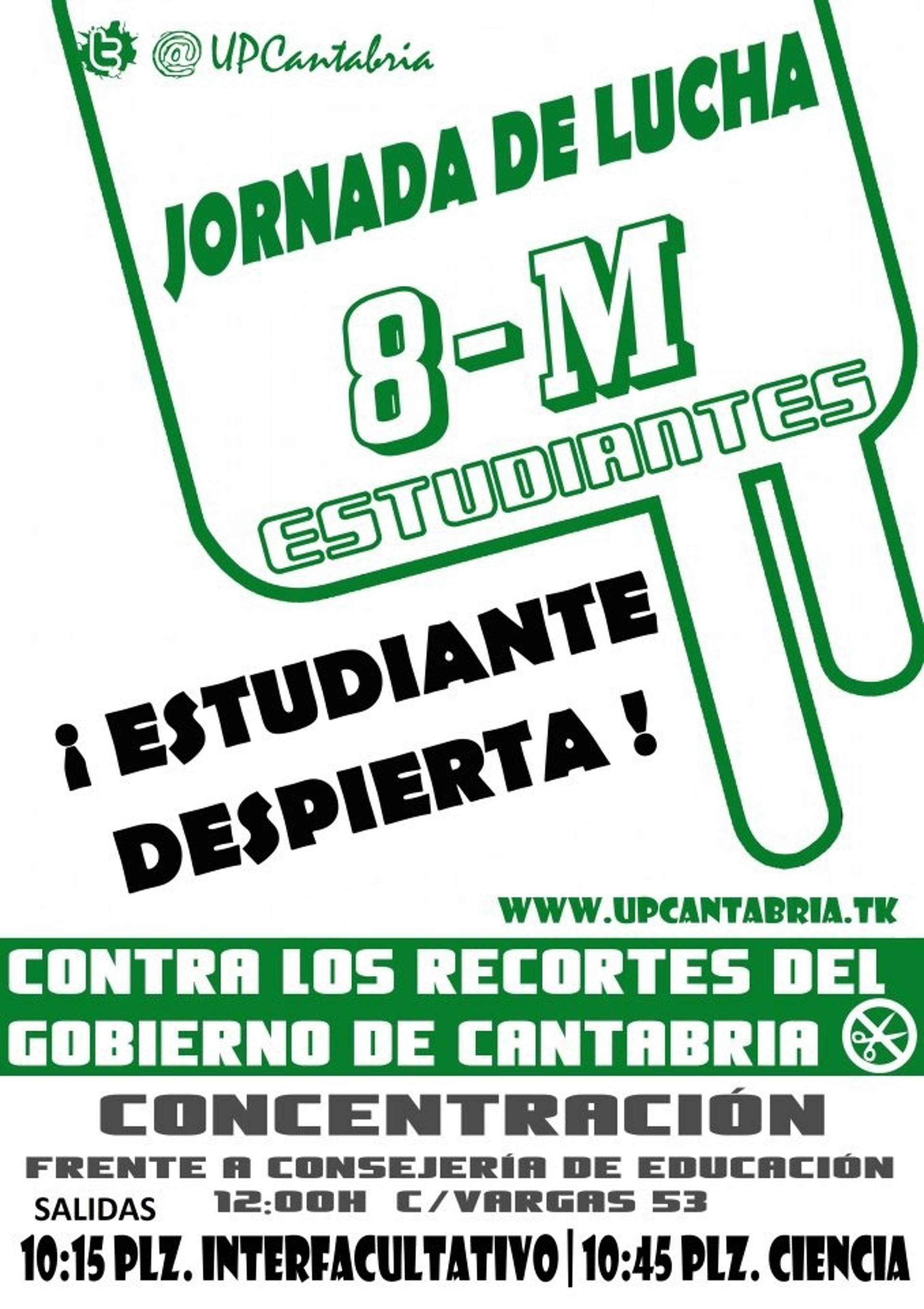 El primer acto organizado por el colectivo, una 'Jornada de lucha', será el 8 de marzo, coincidiendo con la huelga en enseñanzas medias. A las 10.15 horas se partirá de la plaza del Interfacultativo de la UC y a las 10.45 de la plaza de la Ciencia con destino a la concentración que se realizará a las 12.00 horas en el edificio Ministerios (calle Vargas) contra los recortes del Gobierno de Cantabria.