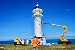 El artista cántabro y su equipo estarán trabajando durante esta semana en una obra mural "adaptada a las necesidades del faro". El resultado será una composición artística que pondrá en valor "la imagen del faro, respetando su función de ayuda a la navegación como señal marítima".