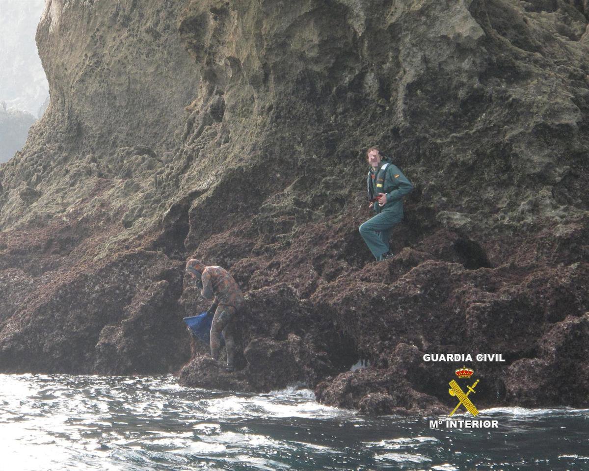 Dos agentes del Servicio Marítimo saltaron a las rocas desde las embarcaciones para inspeccionar el lugar en busca de mariscadores furtivos y localizaron a dos buceadores con trajes de neopreno para mimetizarse con las rocas, que portaban una red-bolsa de pesca con unos tres kilos de percebes en su interior, así como dos rajadas para la extracción del molusco. Estaban mariscando sin poseer autorización para ello.