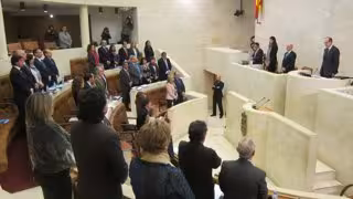 Tras la lectura de la declaración institucional, los diputados se han puesto en pie y han guardado un minuto de silencio que ha concluido con un aplauso en honor a Suárez.