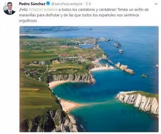 "¡Feliz #DíaDeCantabria a todos los cántabros y cántabras! Tenéis un sinfín de maravillas para disfrutar y de las que todos los españoles nos sentimos orgullosos", ha publicado este domingo Sánchez en un tweet que ha acompañado con una foto de la costa de Cantabria.
