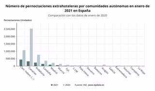 Con la caída de enero, casi tres puntos superior a la de diciembre, las pernoctaciones en alojamientos extrahoteleros acumulan once meses consecutivos de retrocesos interanuales por efecto del Covid.