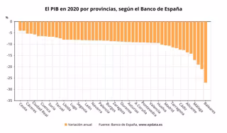 Así, las provincias de Baleares (-27%) y las canarias de Las Palmas y Santa Cruz de Tenerife, junto a Málaga, Gerona y Alicante, registraron las mayores caídas del PIB el año pasado, que estuvo marcado por la "heterogeneidad" del impacto del Covid, siendo mayor en las zonas con mayor peso del turismo e incidencia en la movilidad.