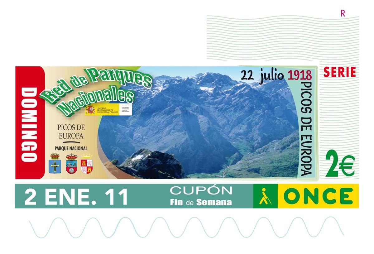 Picos de Europa será el primero de los Parques Nacionales en convertirse en imagen de una serie de cupones de la ONCE que se distribuirán entre los meses de enero y abril de 2011 dedicados a estos espacios. El parque, cuyo territorio comparten Cantabria, Asturias y Castilla y León, protagonizará el cupón del 2 de enero.