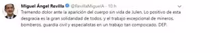 En su tweet, señala como "lo positivo" de este suceso la "gran solidaridad de todos y el trabajo excepcional de mineros, bomberos, guardia civil y especialistas en un trabajo tan complicado".