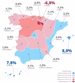 El precio bajó en once comunidades autónomas y subió en seis. En concreto, Baleares (+8%) fue la región en la que más aumentó el precio de la vivienda usada, seguido de Canarias (+7,8%), Andalucía (+3,1%), Comunidad Valenciana y Madrid (con subidas en ambas regiones del 2,4%) y Cataluña (+2,2%).
