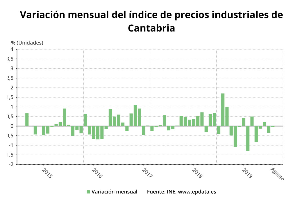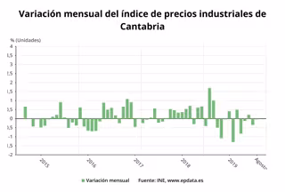 El Índice de Precios Industriales (IPI) bajó un 1,9% en agosto en Cantabria respecto al mismo mes de 2018, según ha informado el Instituto Nacional de Estadística (INE), que indica también que los precios permanecieron estancados en la región respecto al pasado mes de julio.