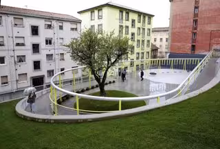 El acceso a la plaza, situada más de 3 metros por debajo de la rasante de la calle San Sebastián, se resuelve mediante una rampa que se apoya en un muro perimetral de hormigón, que, además, sirve para contener los terrenos adyacentes y actúa como soporte a un banco corrido al nivel de la plaza.