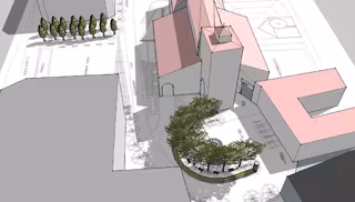 En la esquina entre ambas escaleras, en el jardincillo existente, se propone reubicar la estatua del obispo Eguino y Trecu, que encuentra así un mejor acomodo.
