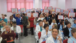 Los participantes en la protesta, que entienden como una "provocación" el hecho de que el proyecto de Valdecilla se haya presentado en el propio hospital, han coreado consignas como 'Valdecilla no se vende, se defiende', 'Por una sanidad pública y de calidad' o 'Más trabajadores, menos directores'. Y cuando la consejera quiso tomar la palabra para iniciar el acto, se lo impidieron con abucheos, gritos y canciones.