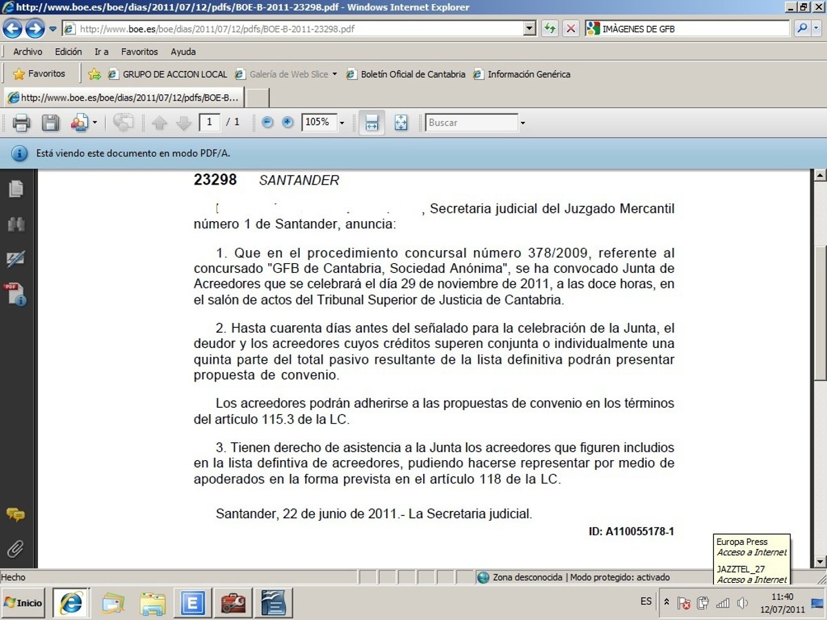 El Boletín Oficial del Estado (BOE) ha publicado este martes el anuncio de la convocatoria, para el próximo 29 de noviembre, de la Junta de Acreedores de GFB.