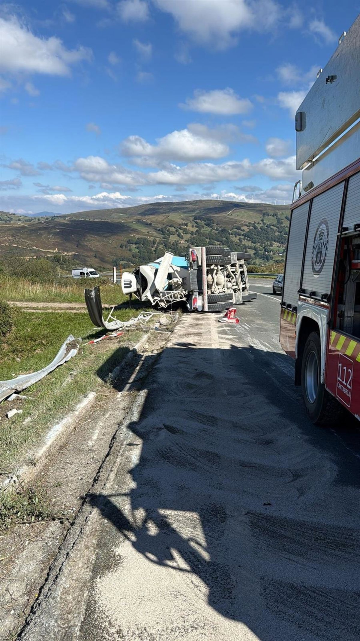 El 112 movilizó para atender el suceso al servicio de urgencias sanitarias 061, Guardia Civil, servicio de Carreteras y Bomberos de Cantabria, que limpiaron los líquidos derramados por la hormigonera sobre la calzada.