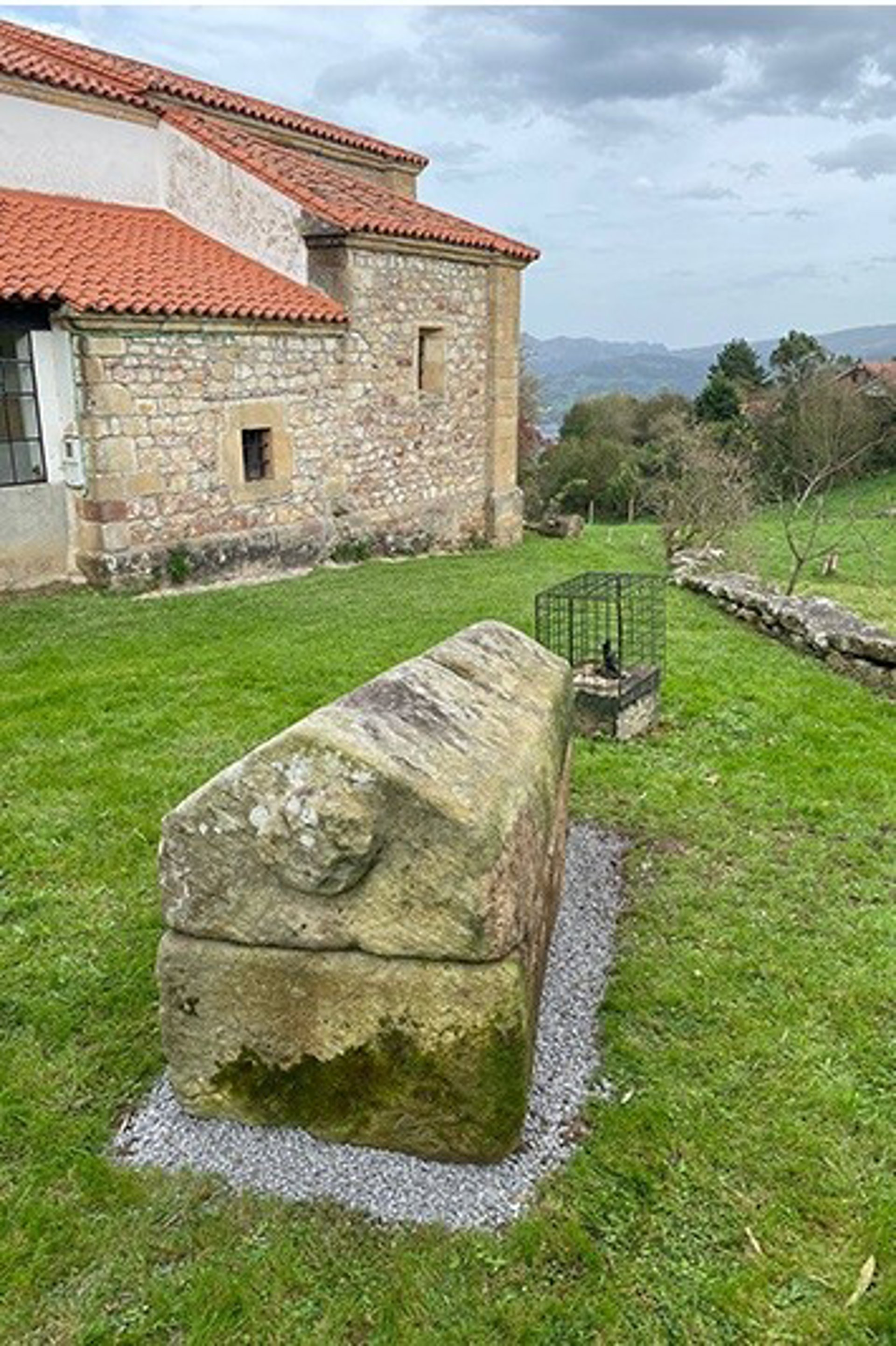 Desde hace varios años, como consecuencia de un argayo en el muro de contención de la plataforma de la iglesia, la pieza arqueológica se había deslizado ladera abajo y yacía en una posición inestable, cruzada e inclinada. Su tapadera se encontraba abierta y rotada respecto a la caja sepulcral.