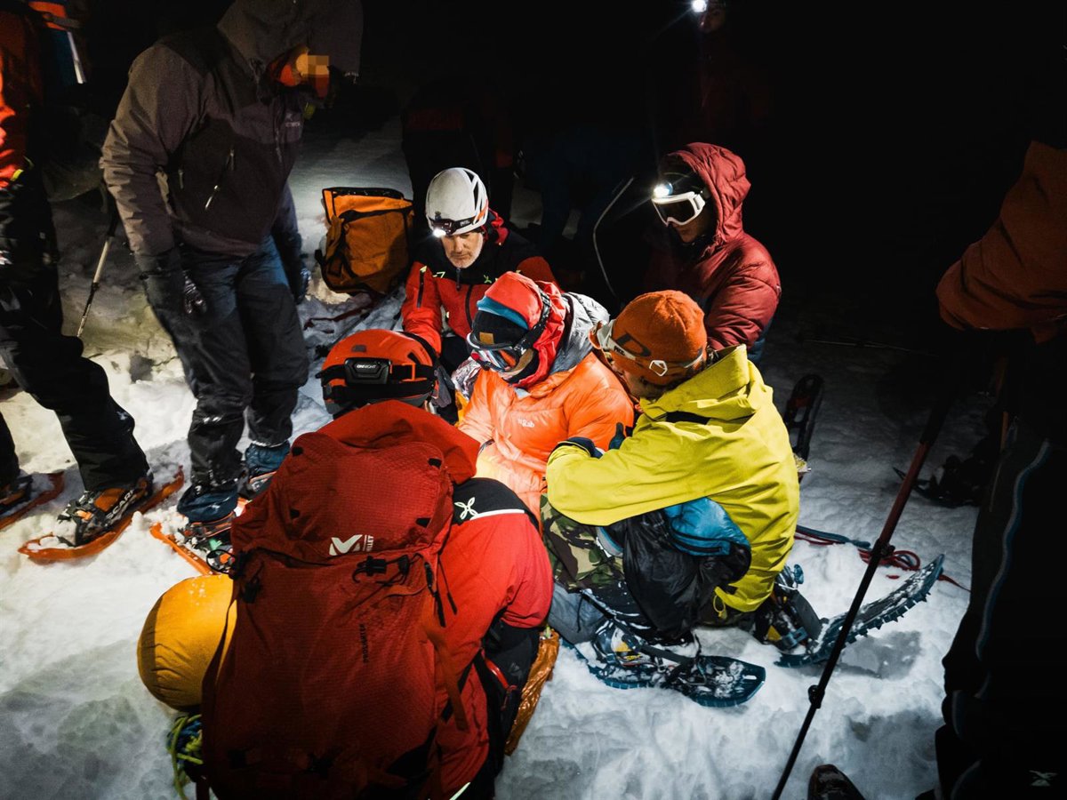 El grupo que ya estaba en Picos de Europa ha iniciado el descenso en dos equipos. Un rescatador y cuatro de los 29 alumnos de la formación han hecho de avanzadilla, haciendo huella en la nieve para recibir al médico y al cuarto rescatista en la estación superior del teleférico, y regresar hasta el segundo equipo, que porteaba al afectado.