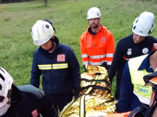 Momento del rescate y traslado a la ambulancia del hombre que cayó en una zona de maleza en San Miguel de Meruelo. - 112 CANTABRIA