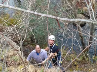 Los efectivos del 112 han utilizado técnicas de rescate vertical para llegar hasta el afectado, le han asegurado y han procedido a su izado hasta una zona exenta de riesgo. Una vez el hombre ha alcanzado la parte alta del cauce, los bomberos han rescatado también al animal.