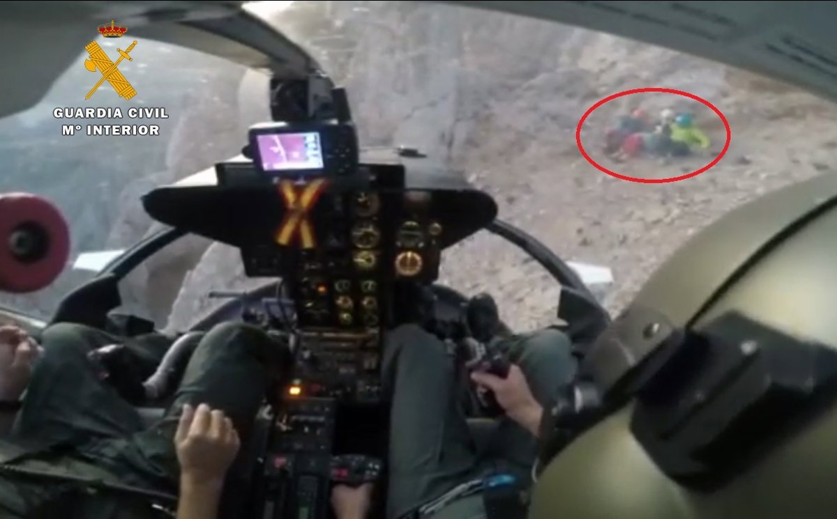 Gracias a la destreza de los pilotos de la Guardia Civil, pudieron realizar un apoyo parcial de uno de los patines de la aeronave sobre la montaña, descendiendo los GREIM a la vía de escalada, para evacuar a los montañeros e introducirlos en el helicóptero.