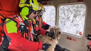 El rescatador ha descendido hasta la perra en grúa, la ha asegurado un arnés específico y la ha izado hasta la aeronave, "mostrándose dócil en todo momento".