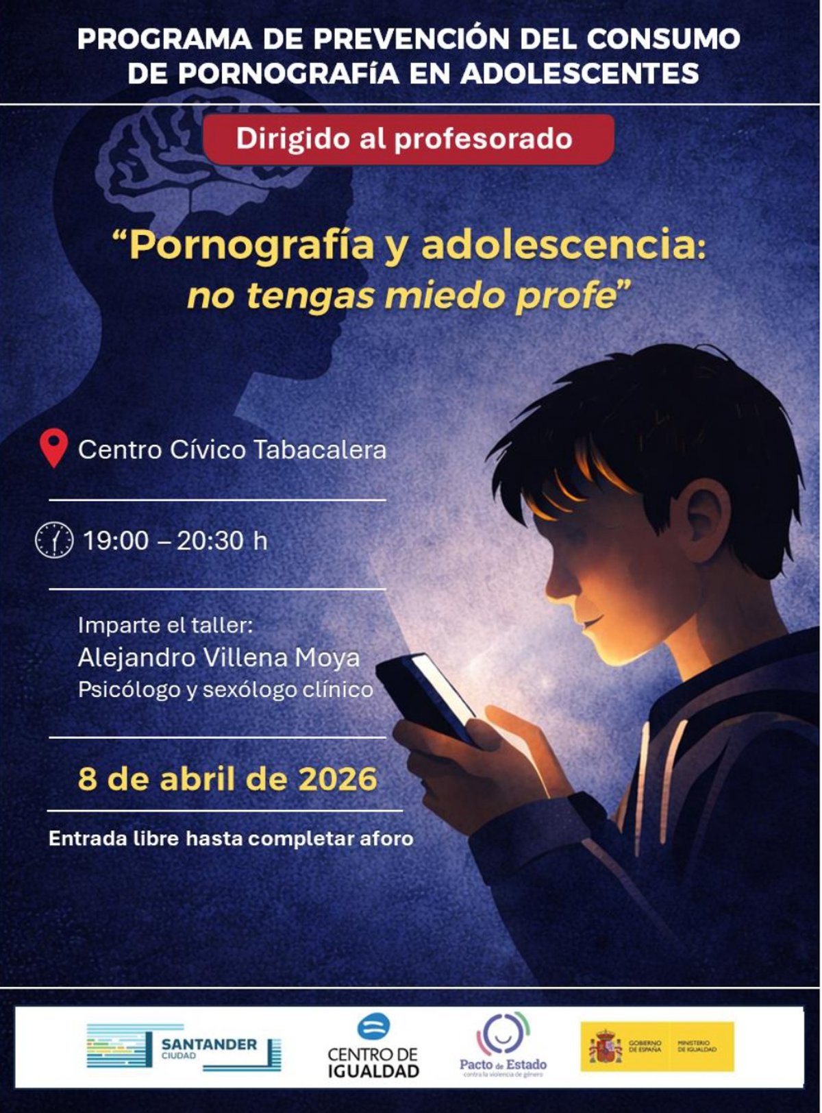 El Ayuntamiento de Santander ha organizado un programa de prevención del consumo de pornografía en adolescentes, que se concretará en dos talleres informativos dirigidos al profesorado y las familias, los cuales tendrán lugar los días 8 y 9 de abril en el centro cívico de Tabacalera.