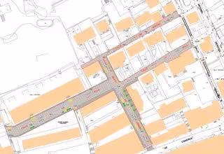 Por ello, aprovechando la mayor anchura de la acera en esa zona, se plantea una solución singular de pavimento, con piezas de mayor dimensión y espesor en un despiece que envuelva los alcorques, redimensionándolos para alinearlos con el pavimento. En este caso, las losas de hormigón serán del mismo tamaño (cuadradas y de 40x40x8) pero en tonos variados.