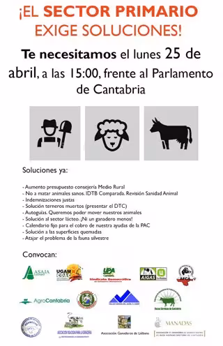 El sector primario de Cantabria ha convocado una concentración "multitudinaria" el próximo lunes, 25 de abril, a las 15 horas, frente al Parlamento de Cantabria, con el fin de exigir al Gobierno y a los grupos parlamentarios soluciones a los problemas del sector ante la "inacción" de la Administración.