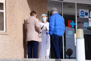 Una sanitaria atiende a dos personas a la entrada del Centro de Salud de Cazoña. Archivo - Juan Manuel Serrano Arce - Europa Press