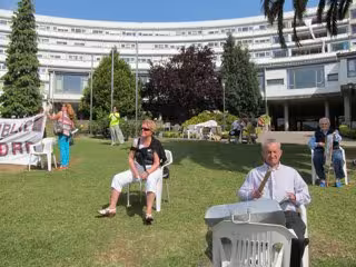 Los residentes que quedan en La Pereda y los trabajadores se han vuelto a concentrar este sábado, de 10.30 a 11.30 horas, en los jardines de la residencia con pancartas de protesta por el cierre y utensilios de cocina que emplean para hacerse oír.