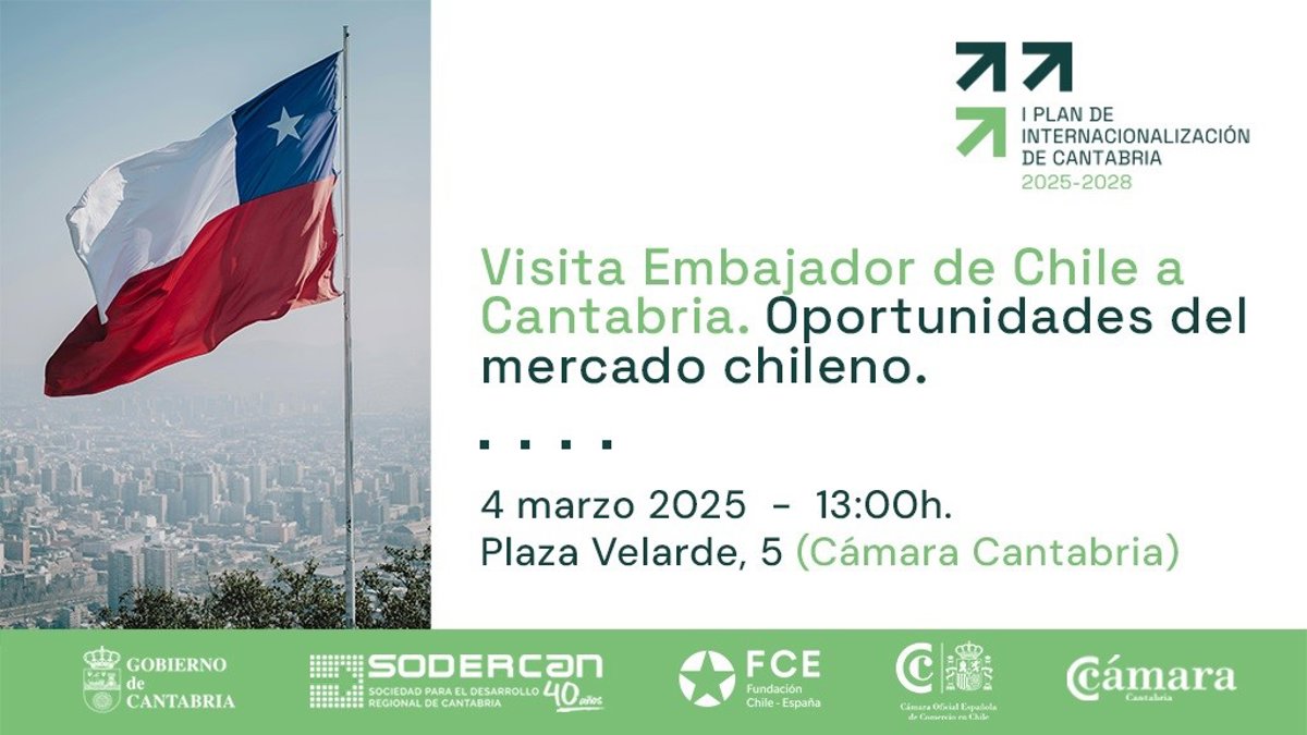 La Sociedad para el Desarrollo Regional de Cantabria, SODERCAN (www.sodercan.es), y Cámara Cantabria organizan la jornada presencial 'Oportunidades del mercado chileno', que tendrá lugar este martes, 4 de marzo, de 13 a 14.30 horas, en la sede cameral de la plaza Velarde 5 de Santander.