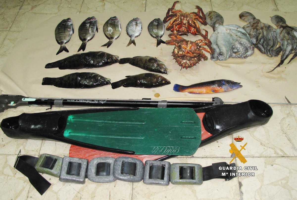 Los agentes le intervinieron 15 ejemplares de jargos, durdos, pulpos y centollos, material utilizado para la pesca como arpón, cinturón con plomos y aletas para el buceo.
