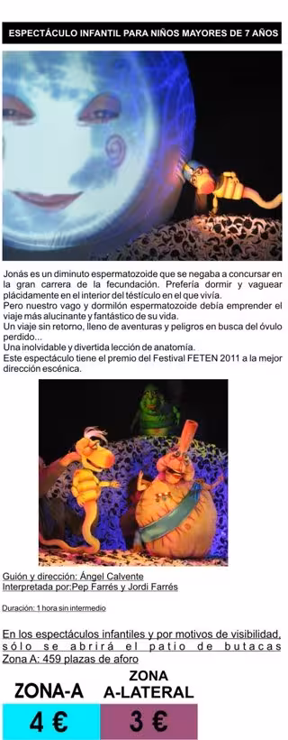 El Teatro Municipal Concha Espina (TMCE) de Torrelavega acogerá este domingo la representación de la obra infantil 'El Fantástico Viaje de Jonás el Espermatozoide', que ha sido reconocida en la Feria Europea de Artes Escénicas para Niños y Niñas con el Premio Feten 2011 a la Mejor Dirección.