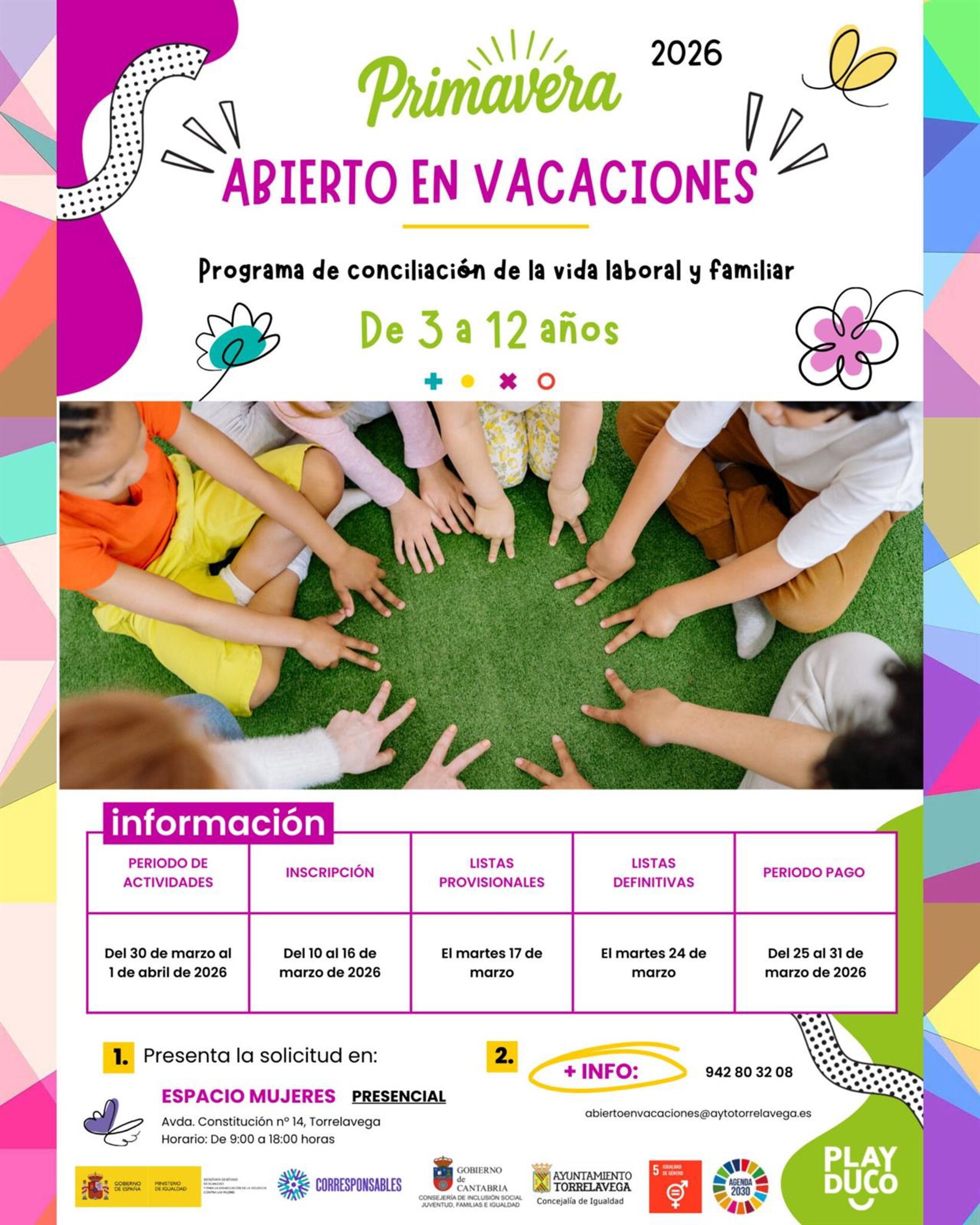 Torrelavega abrirá del 10 al 16 de marzo el plazo de solicitud de plaza para participar en el programa municipal de conciliación 'Abierto en Vacaciones Primavera 2026', dirigido a niños de entre 3 y 12 años que estén empadronados en el municipio, y que se prestará del 30 de marzo al 1 de abril, ambos inclusive.