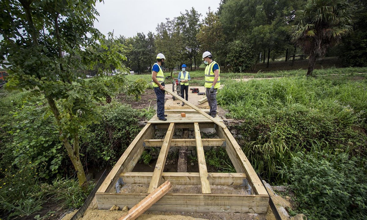 Según ha informado el Consistorio en nota de prensa, esta zona contaba con un pequeño paso de hormigón que carecía de barandillas, y esta pasarela de madera en el mismo lugar se integra mejor dentro de este espacio verde que se espera poder abrir al público este mes de septiembre.