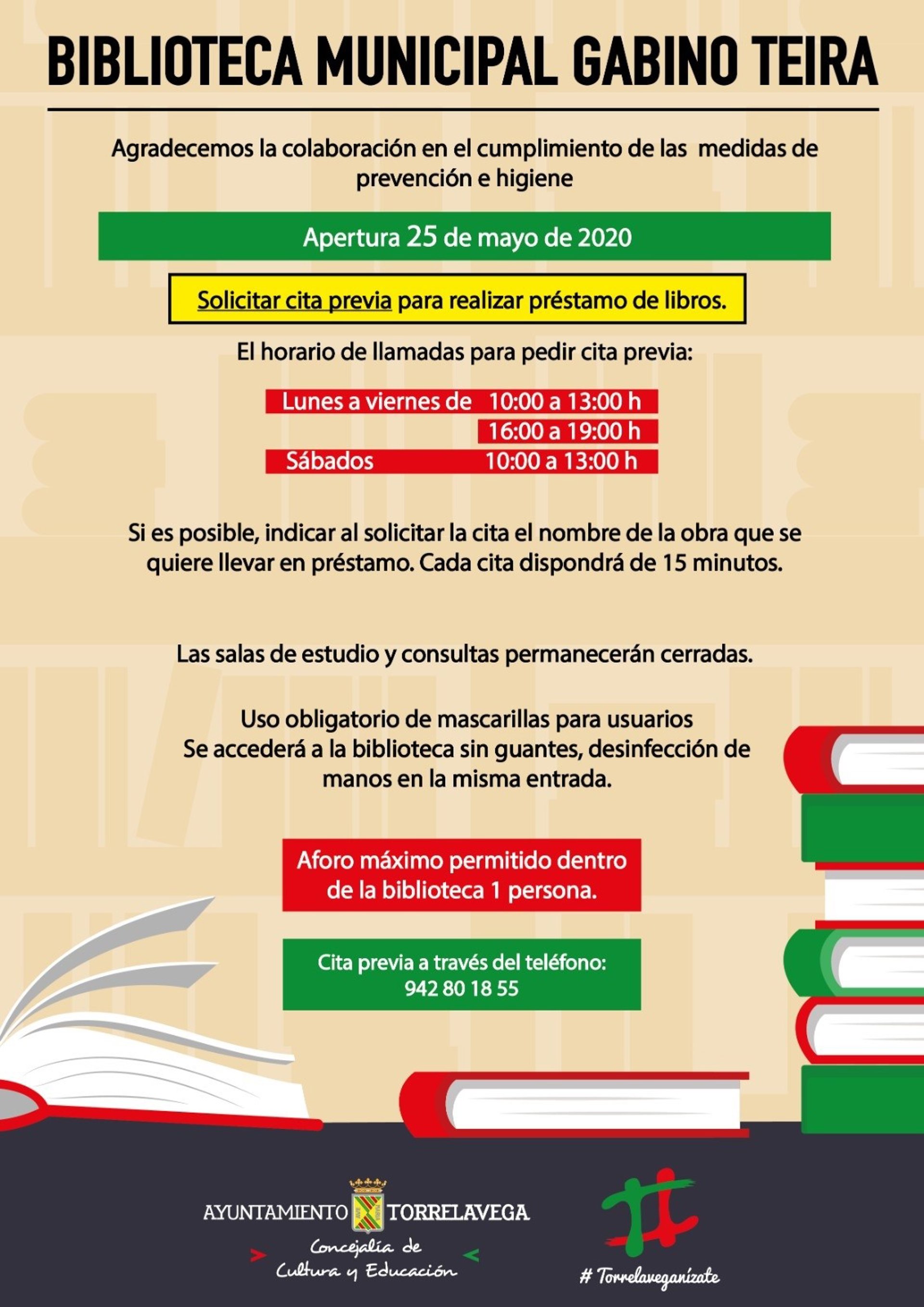 El Ayuntamiento de Torrelavega ha anunciado que la Biblioteca Gabino Teira y el Archivo Municipal reabrirán el próximo lunes, 25 de mayo, aunque con medidas de seguridad y obligatoriedad de cita previa.